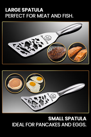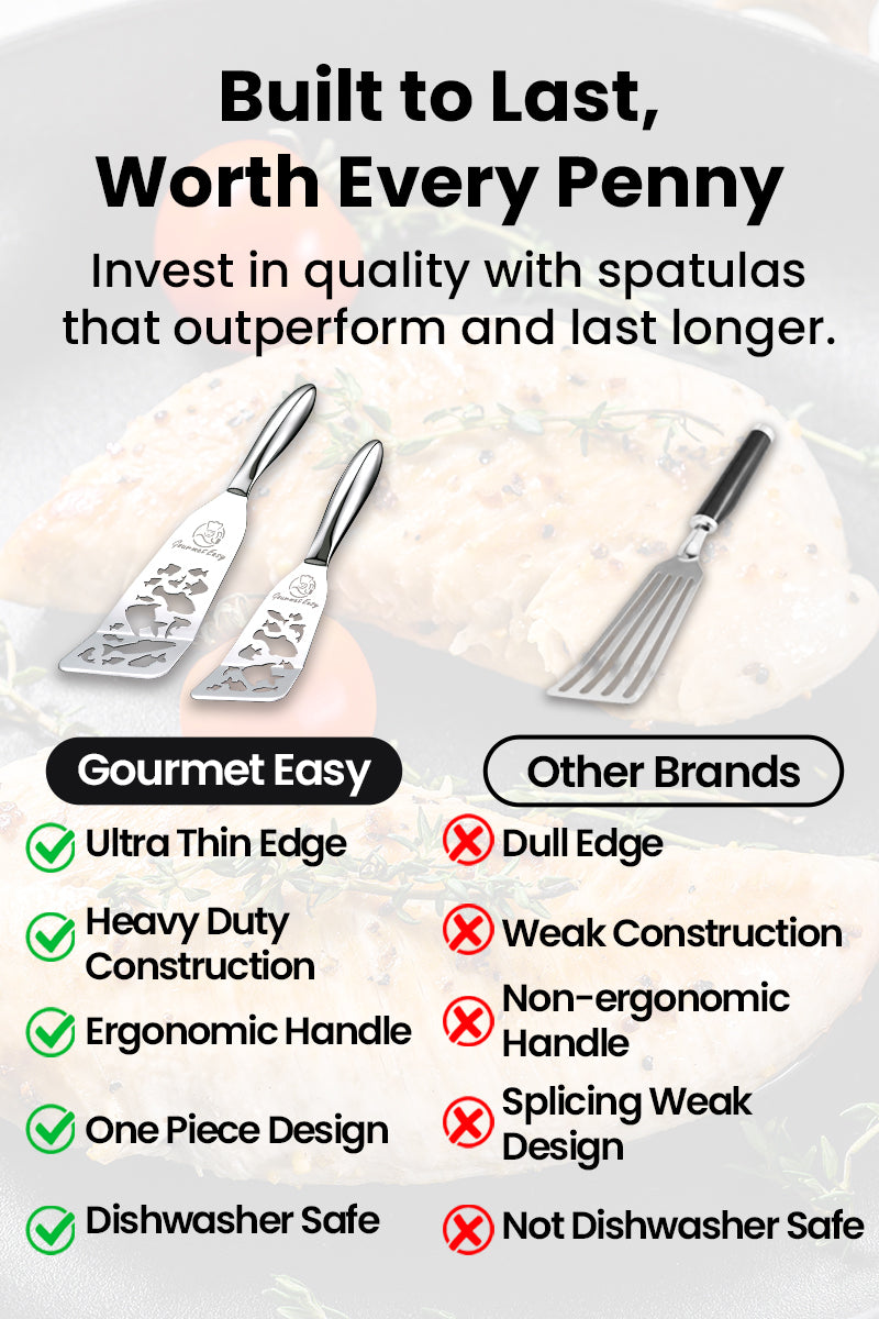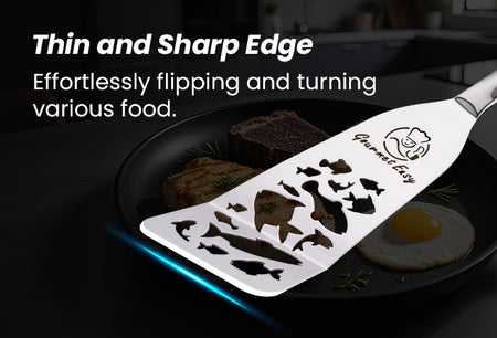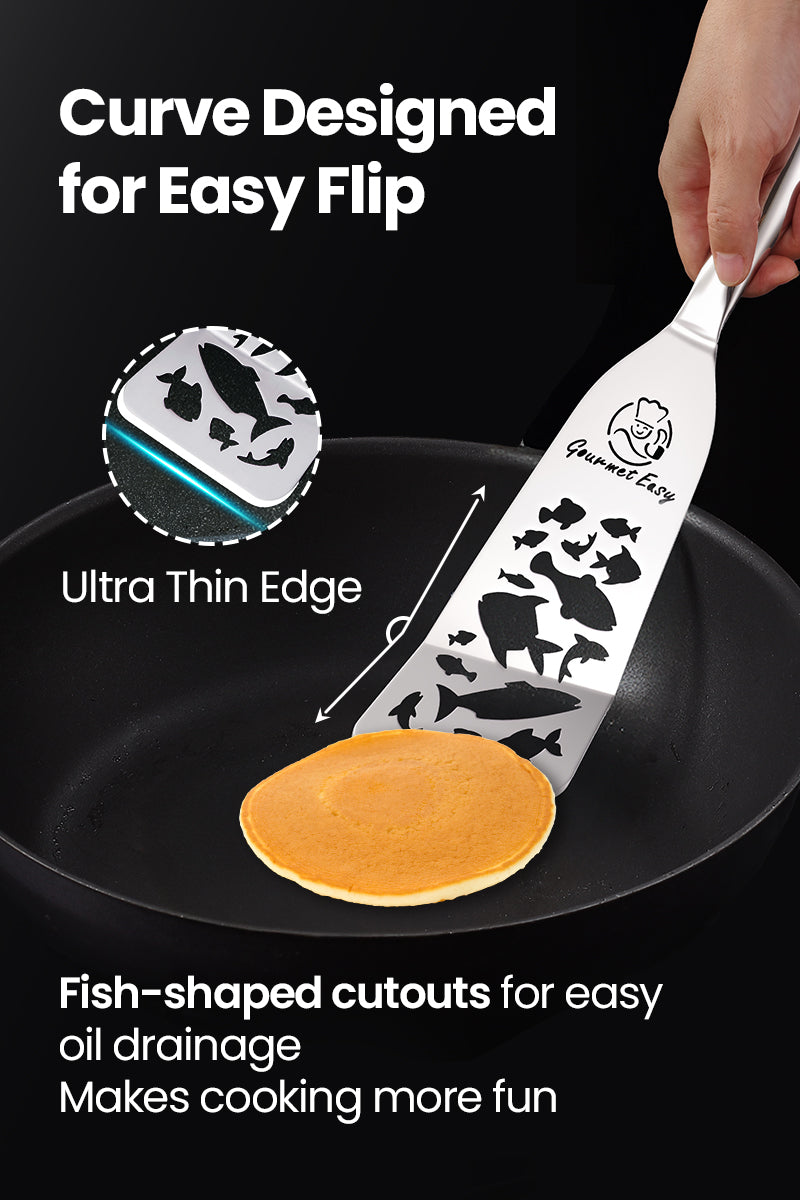 ULTRA-THIN EDGE FOR EASY FLIPPING: This stainless steel spatula features a slim slotted edge that slides smoothly under delicate foods like fish, eggs, or pancakes without tearing. Perfect for flipping omelets, pancakes, and more.