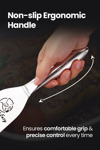 ERGONOMIC HANDLE - EASY GRIP: Non-slip handle provides a secure grip, even with wet hands. Perfect for flipping eggs, sautéing, or lifting, this spatula makes cooking with your stainless steel kitchen utensils collection effortless and precise.