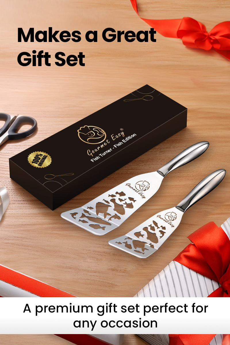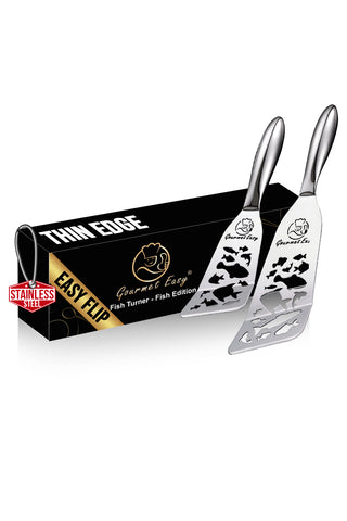FUNKY & FUNCTIONAL FISH DESIGN: Fish-shaped cutouts make draining oil easy while adding style to your kitchen. A playful yet practical addition to your stainless steel kitchen utensils.