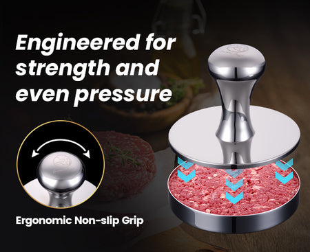 EVEN PRESSURE & ERGONOMIC GRIP: This hamburger patty maker applies even pressure for consistent patties. The ergonomic, non-slip handle ensures comfort and control, making burger shaping fast, easy, and mess-free.